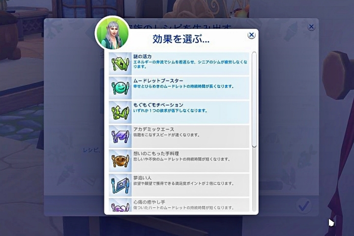 ここで選べる効果は、シムがアンロックしたヤツしか選べない。