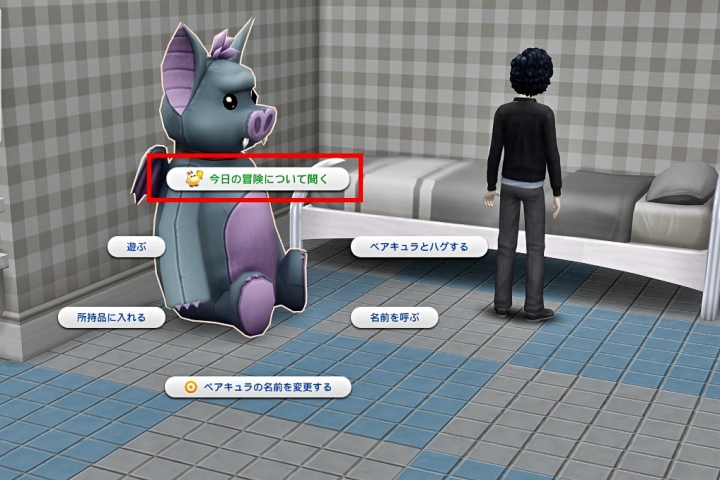 ぬいぐるみをクリックすると、『今日の冒険について聞く』が表示される。